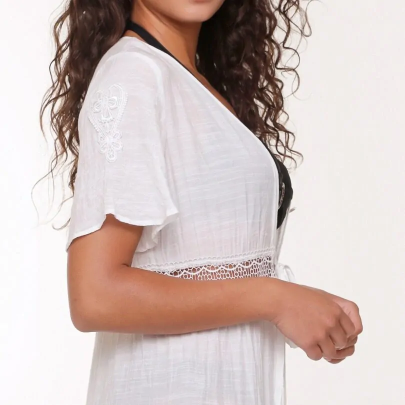 Krásné, dlouhé kimono 6525 od značky Linga Dore v bílé barvě ve velikosti S/M - 36/38. Kimono je z lehkého materiálu, vhodné na plavky. Pod prsy je dvojí zavazování, ve stejné části je po obvodu všitá krajka, na rukávech krásná výšivka.
