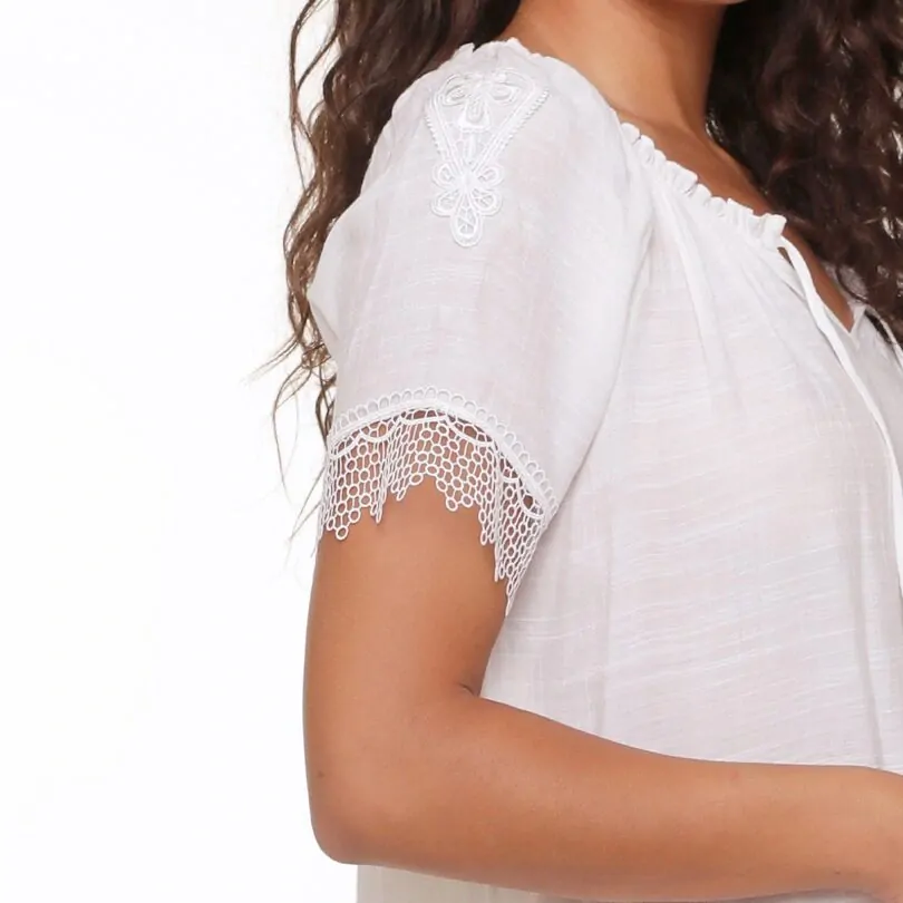 Nádherná a lehká dámská tunika 6524 od značky Linga Dore v bílé barvě ve velikostech S-36 a M-38. Tunika je krásným plážovým oblečením na plavky, je z velice příjemného materiálu, lehká, s jemným zdobením krajky na rukávech. Rukávy zdobí také krásná výšivka, v horní části krku je provázek ke stažení vrchní části a k zavázání.