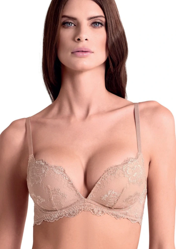 Krajková push-up podprsenka od značky Lormar. Vyztužená krajková podprsenka s push-up efektem s krásnou luxusní krajkou. Podpsenka je díky bezkosticové variantě velmi příjemná a pohodlná pro celodenní nošení. Krajka je po celém spodním obvodu a po obvodu košíčků. Podprsenka má hladká nastavitelná ramínka.